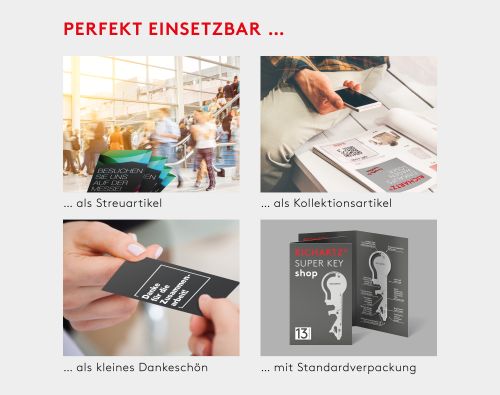 Das kleine Tool wird zum unverzichtbaren Begleiter Ihrer Kunden und Mitarbeiter. Sie haben Fragen zum Super Key Shop? Dann sprechen Sie uns jetzt an und wir erstellen zusammen Ihr persönliches Multifunktionswunder!